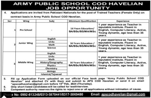 Army Public School APS jobs advertisement dated about 31 January 2024 in daily Aaj Newspaper invites application for the vacant post of female english teacher, female maths teacher, female tajweed teacher, female urdu teacher, female science teacher, female geography teacher, female chemistry teacher, female history teacher, female biology teacher, female physics teacher, female islamit teacher and female preschool teacher in Havelian, havelian Khyber Pakhtunkhwa KPK Pakistan. MA, M.sc and BA etc. educational qualification will be preferred.