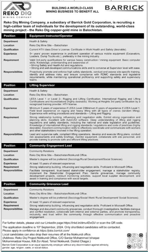 Barrick Pakistan invites applications for job positions advertised in daily Jang dated 27 August 2024 for following vacancies in Chaghi, chaghi Balochistan Pakistan.