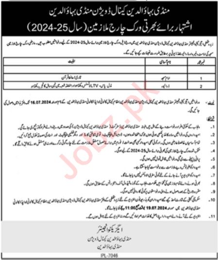 Canal Division is looking for candidates for following posts as per job advertisement published in daily Dunya Newspaper of July 28, 2024 for location Mandi Bahauddin, mandi bahauddin Punjab Pakistan: