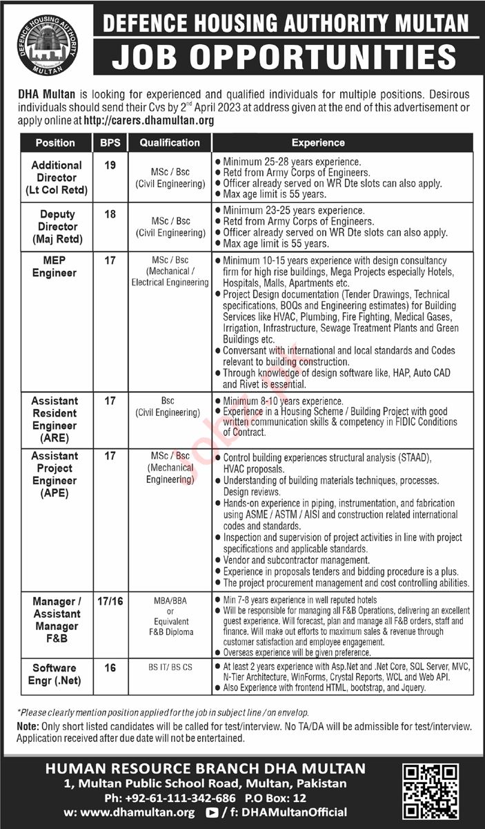 Defence Housing Authority DHA jobs advertisement dated about 26 March 2023 in daily Nawaiwaqt Newspaper invites application for the vacant post of software engineer dotnet, assistant manager fb, assistant resident engineer, deputy director, additional director, assistant project engineer, mep engineer and manager fb in Multan, multan Punjab Pakistan. M.sc, BIT, B.E, BCS, BBA and MBA etc. educational qualification will be preferred.