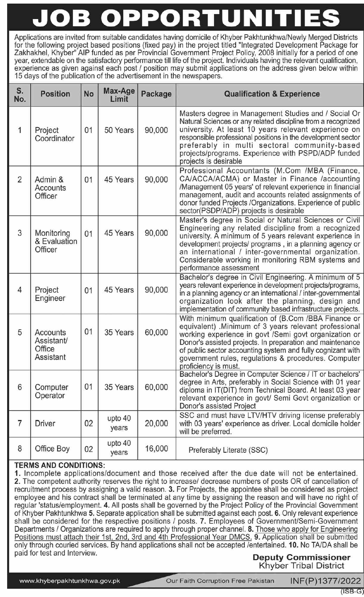 Vacant posts including project coordinator, driver, monitoring evaluation expert, office boy, computer operator, office assistant, admin accounts officer, project engineer and accounts assistant are announced in Deputy Commissioner District Office Peshawar, peshawar Khyber Pakhtunkhwa KPK Pakistan as per 11 March 2022 advertisement in daily Dawn Newspaper. Persons with BCS, MBA, B.com, CA, BBA, MS, B.E, ACCA, Others, M.com, BIT, Master and Matric etc. education can apply.