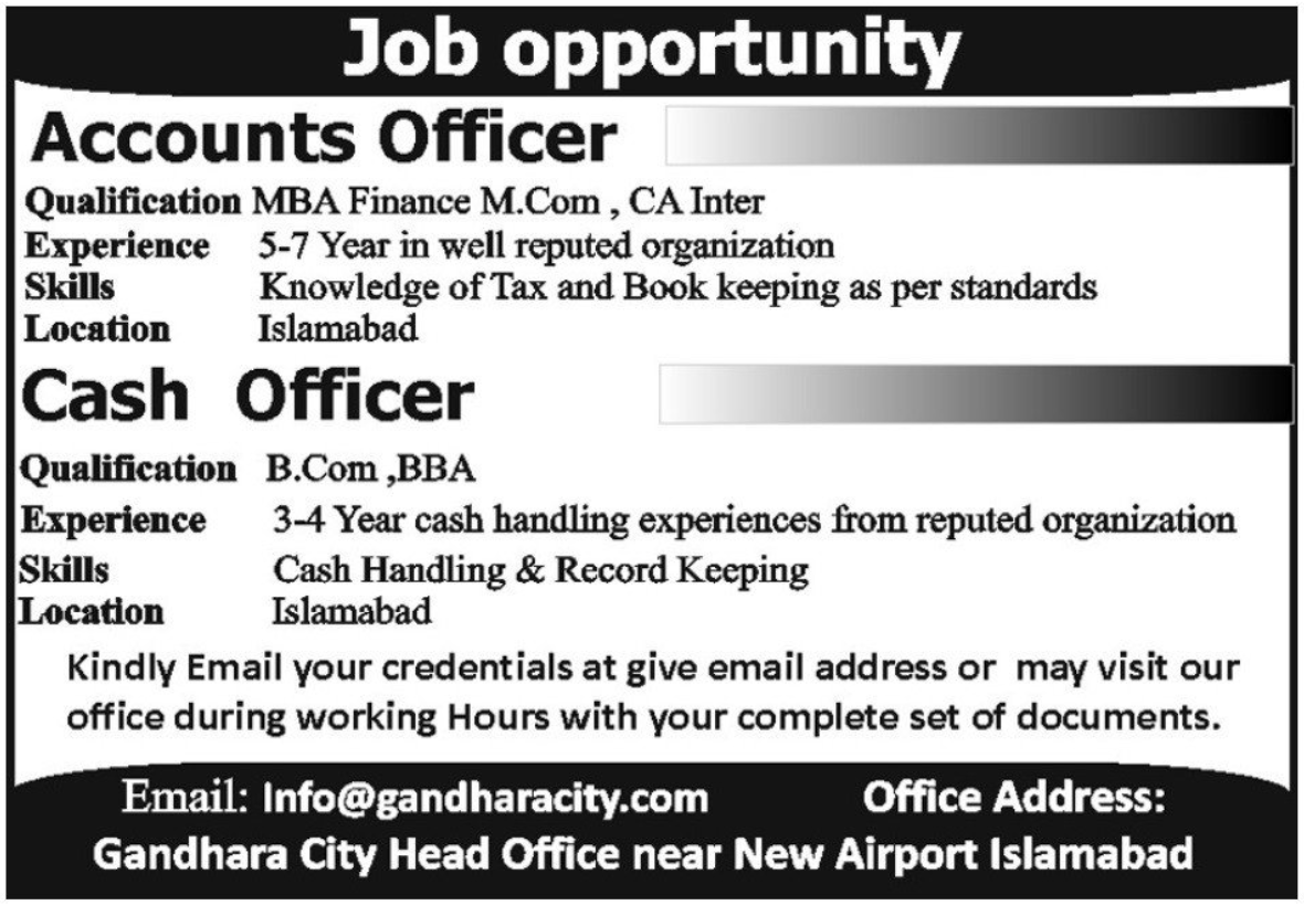 Gandhara City Pvt Ltd Islamabad, islamabad Islamabad Pakistan invites applications from eligible candidates for the post of cash officer and accounts officer as per advertisement of September 24, 2024 published in daily Express Tribune Newspaper. BBA, CA, M.com, B.com and MBA etc. educational qualification will be preferred.