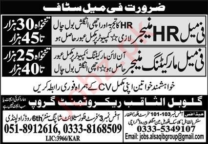 Global Al Saqib Recruitment Group jobs advertisement dated about 15 May 2022 in daily Express Newspaper invites application for the vacant post of female marketing manager and female hr manager in Karachi, rawalpindi and karachi Sindh Pakistan. Candidates with Master and Bachelor etc. educational background will be preferred.