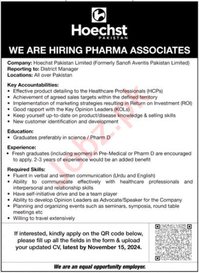 Hoechst Pakistan Rawalpindi, rawalpindi Punjab Pakistan invites applications from eligible candidates for the post of pharma associate as per advertisement of November 3, 2024 published in daily Jang Newspaper. Educational qualifications required Bachelor and Pharma D etc.