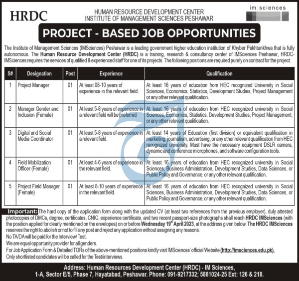 Institute of Management Sciences Peshawar, peshawar Khyber Pakhtunkhwa KPK Pakistan invites applications from eligible candidates for the post of female manager gender inclusion, digital social media coordinator, female project field manager, female field mobilization officer and project manager as per advertisement of April 5, 2023 published in daily Aaj Newspaper. Educational qualifications required Bachelor and Master etc.