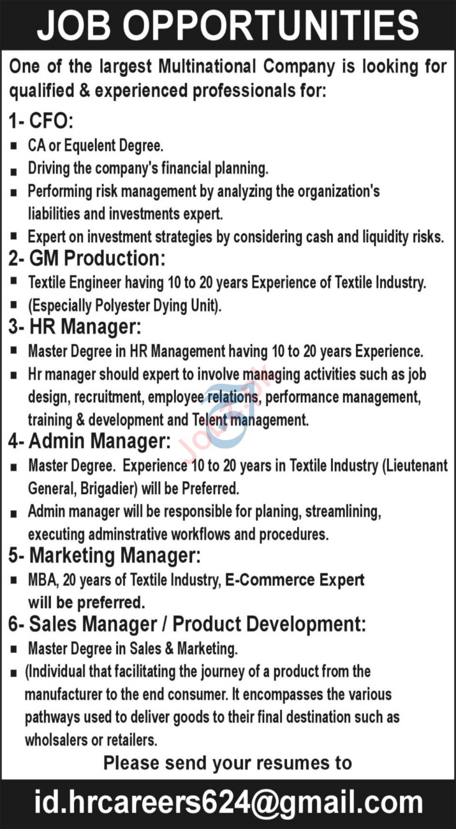Vacant posts including marketing manager, admin manager, gm production, hr manager, chief financial officer and sales manager are announced in Multinational Company Islamabad, islamabad Islamabad Pakistan as per 28 July 2024 advertisement in daily Aaj Newspaper. CA, Master, MBA and Bachelor etc. educational qualification will be preferred.