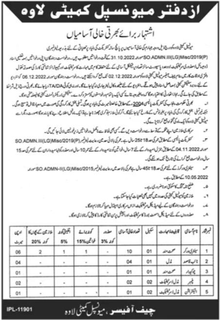 Municipal Committee jobs advertisement dated about 18 November 2022 in daily Dunya Newspaper invites application for the vacant post of naib qasid, chowkidar, plumber, electrician and sanitary worker in Talagang, talagang Punjab Pakistan. Preferred Education is Middle and Primary etc.