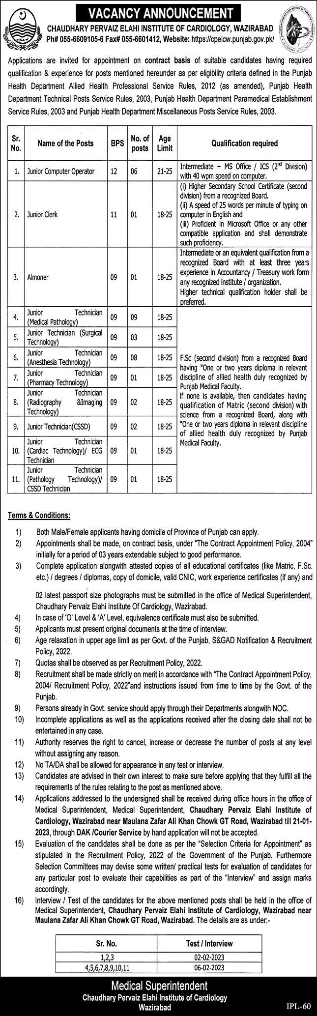 Chaudhry Pervaiz Elahi Institute of Cardiology jobs advertisement dated about 3 January 2023 in daily Khabrain Newspaper invites application for the vacant post of almoner, clerk, technician cssd, ecg technician, technician surgical technology, technician cardiac technology, technician radiography imaging technology, technician medical pathology, technician anesthesia technology, technician pharmacy technology, computer operator, cssd technician and technician pathology technology in Wazirabad, wazirabad Punjab Pakistan. Persons with Intermediate and Others etc. education can apply.