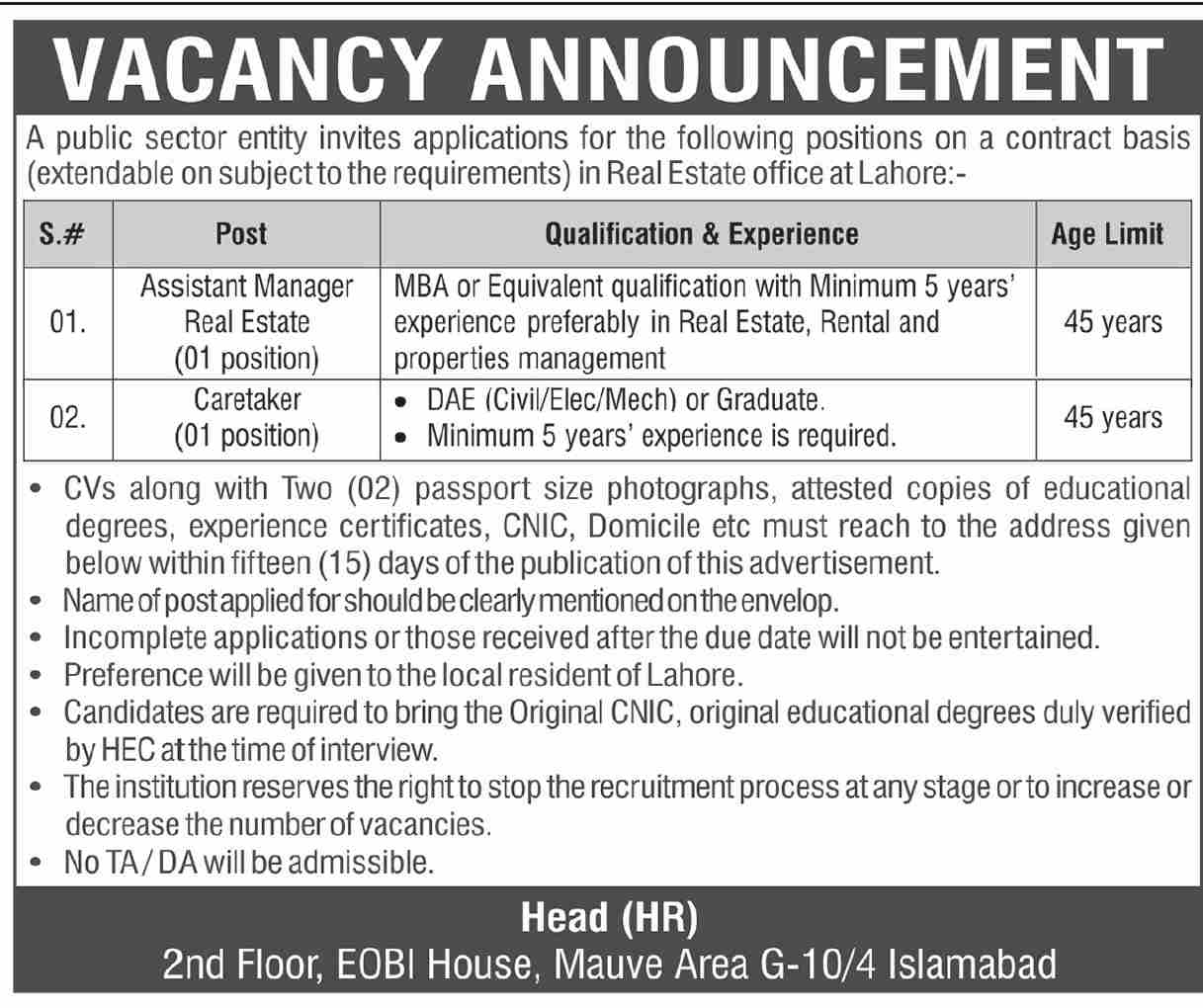 Apply as per details in job advertisement. Login to view further details of how to apply via https://www.jobz.pk online.