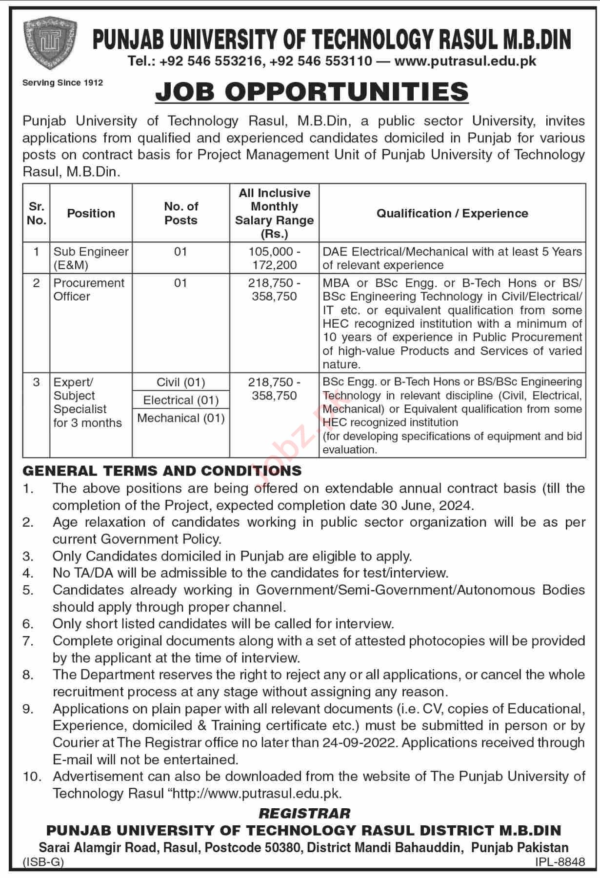 Punjab University of Technology Rasul jobs advertisement dated about 4 September 2022 in daily Dawn Newspaper invites application for the vacant post of subject specialist, sub engineer em and procurement officer in Mandi Bahauddin, mandi bahauddin Punjab Pakistan. Persons with Master, MBA, B.E, Bachelor and DAE etc. education can apply.