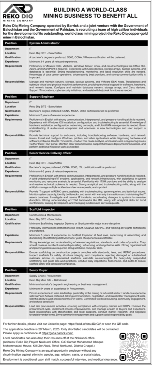 Reko Diq Mining Company RDMC invites applications for job positions advertised in daily Jang dated 22 March 2025 for following vacancies in Chaghi, chaghi Balochistan Pakistan.