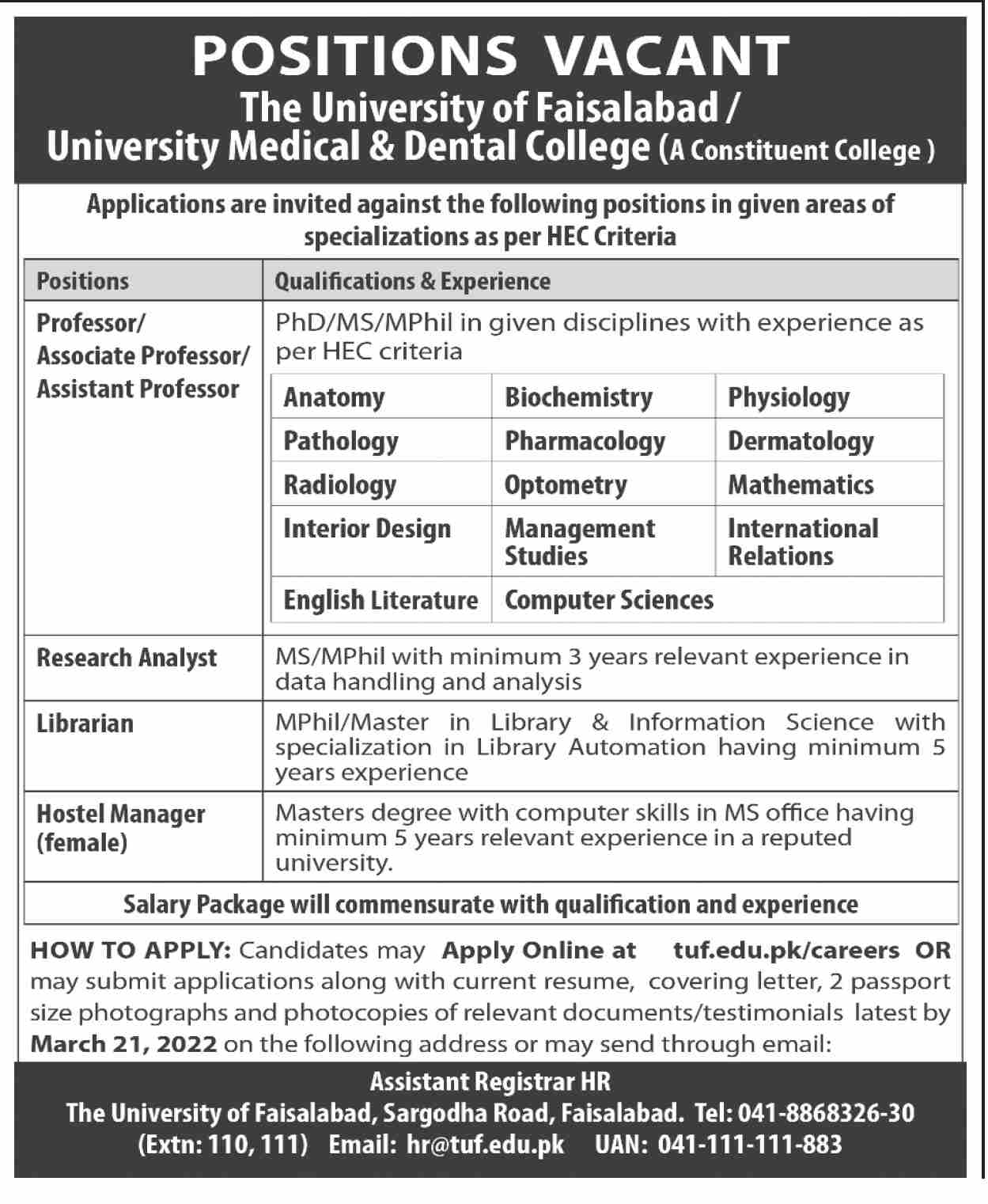 Vacancies in The University of Faisalabad Advertisement March 2022