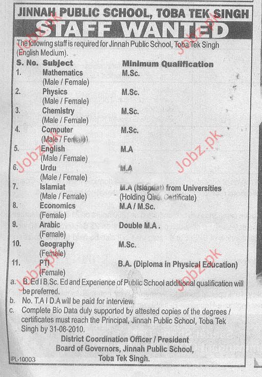 Job Opportunities In Jinnah Public School Toba Tek Singh