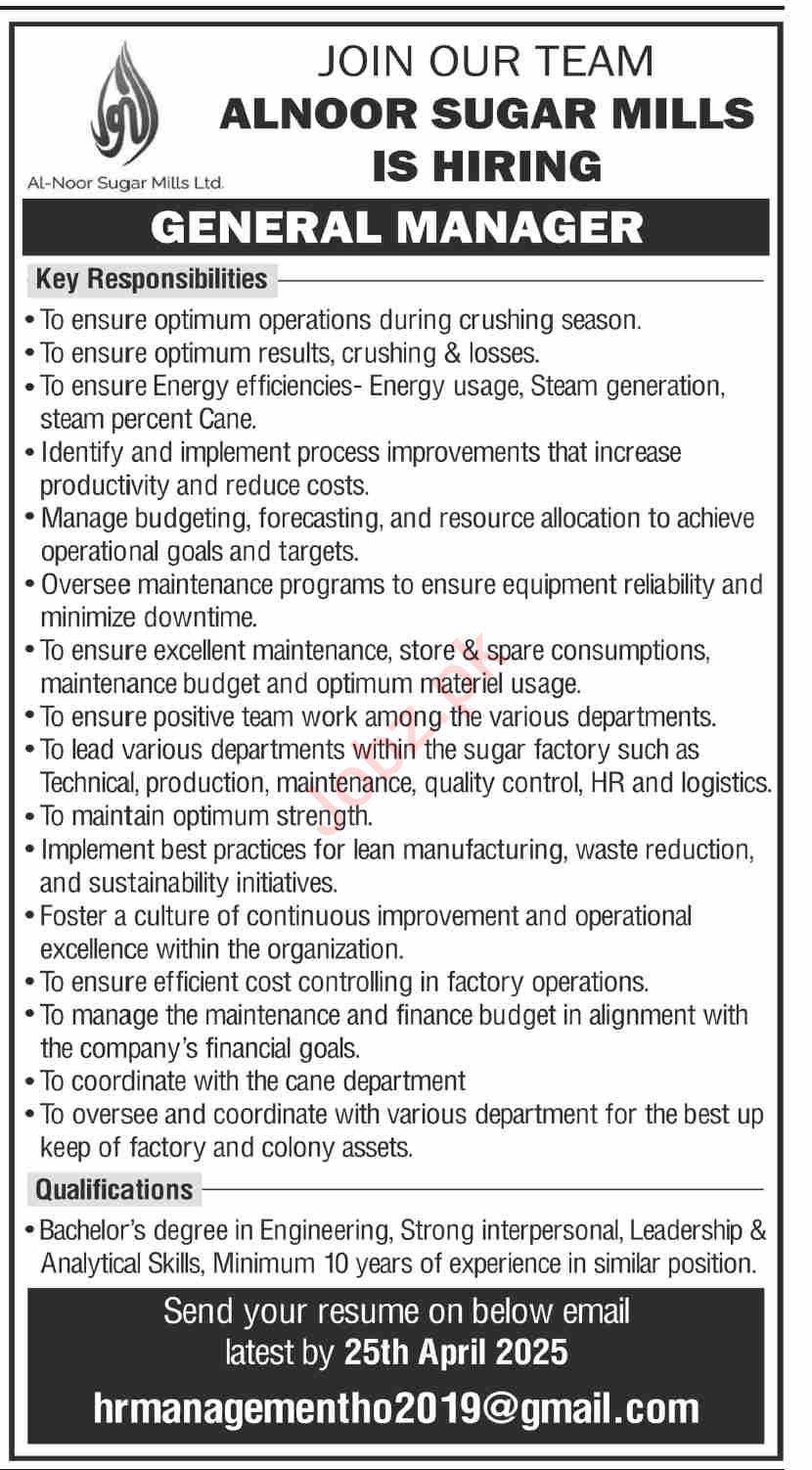 AlNoor Sugar Mill latest Private Management jobs and others can be applied till April 25, 2025 or as per closing date in newspaper ad. Read complete ad online to know how to apply on latest AlNoor Sugar Mill job opportunities.