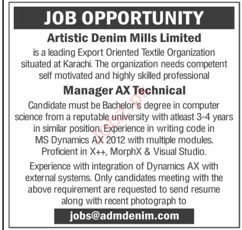Artistic Denim Mills Limited invites applications for job positions advertised in daily Dawn dated 22 December 2024 for following vacancies in Karachi, karachi Sindh Pakistan.