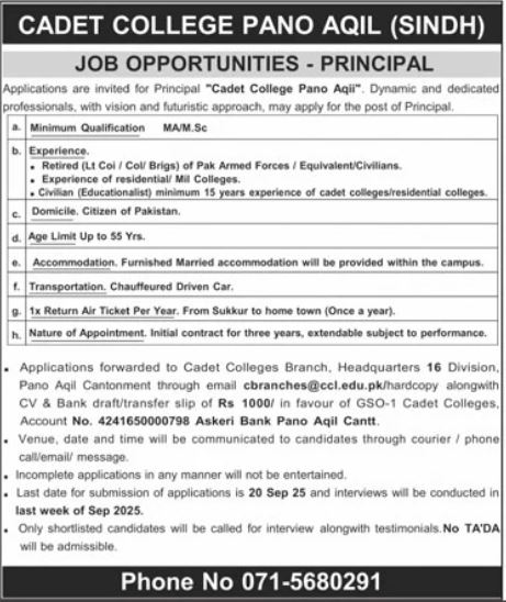 Cadet College invites applications for job positions advertised in daily Jang dated 13 September 2025 for following vacancies in Pano Aqil, pano aqil Sindh Pakistan.