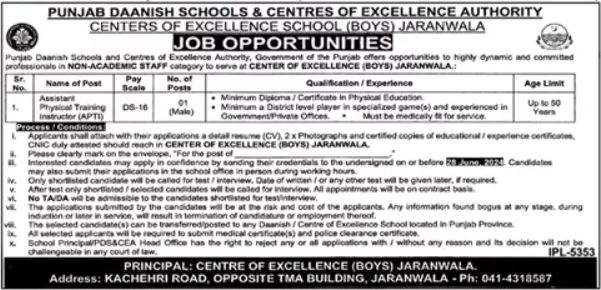 Vacant posts including assistant physical training instructor are announced in Punjab Daanish Schools & Center Of Excellence Authority Jaranwala, jaranwala Punjab Pakistan as per 7 June 2024 advertisement in daily Dunya Newspaper. Educational qualifications required Intermediate and Others etc.