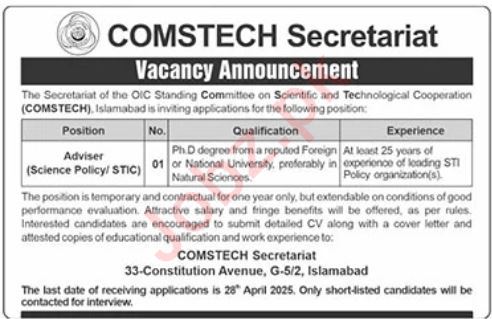 Vacant posts including adviser are announced in COMSTECH Secretariat G-5 Islamabad, islamabad Islamabad Pakistan as per 13 April 2025 advertisement in daily The News Newspaper. Phd etc. educational qualification will be preferred.