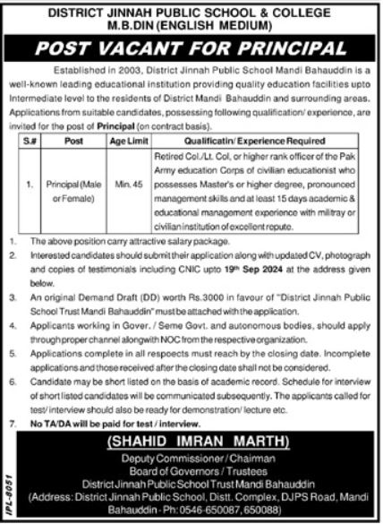 District Jinnah Public School and College Mandi Bahauddin, mandi bahauddin Punjab Pakistan invites applications from eligible candidates for the post of principal as per advertisement of August 28, 2024 published in daily Khabrain Newspaper. Candidates with Master etc. educational background will be preferred.