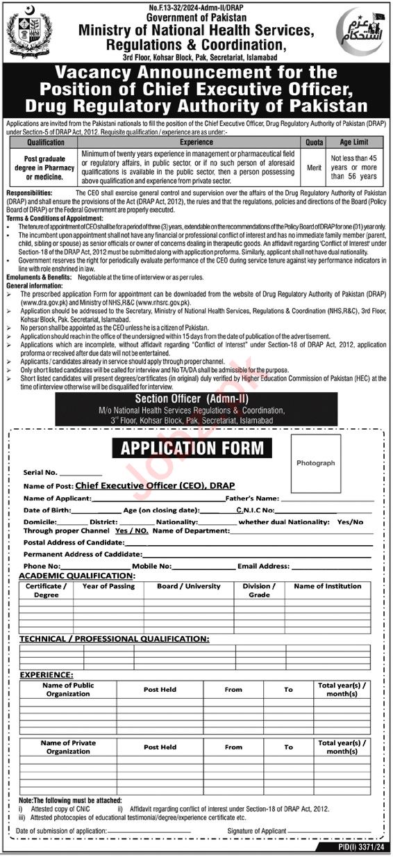 Ministry of National Health Services Regulations & Coordination NHSRC Islamabad, islamabad Islamabad Pakistan invites applications from eligible candidates for the post of chief executive officer as per advertisement of November 18, 2024 published in daily Nawaiwaqt Newspaper. Master and Bachelor etc. educational qualification will be preferred.