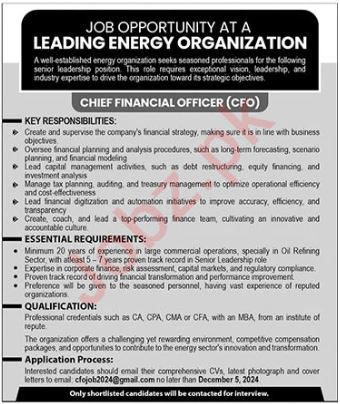 Private Organization Lahore, lahore Punjab Pakistan invites applications from eligible candidates for the post of chief financial officer cfo as per advertisement of November 24, 2024 published in daily The News Newspaper. Persons with Bachelor and Master etc. education can apply.