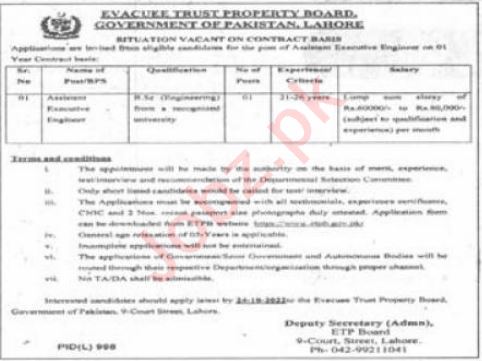 Latest Evacuee Trust Property Board Engineering Posts Lahore 2025
