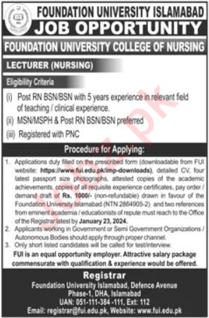 Foundation University Islamabad Islamabad, islamabad Islamabad Pakistan invites applications from eligible candidates for the post of lecturer nursing and lecturer as per advertisement of January 14, 2024 published in daily Dunya Newspaper. MS and Others etc. educational qualification will be preferred.