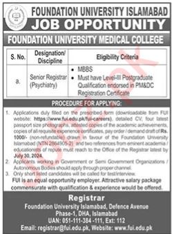 Foundation University Islamabad Islamabad, islamabad Islamabad Pakistan invites applications from eligible candidates for the post of registrar psychiatry as per advertisement of July 14, 2024 published in daily The News Newspaper. Preferred Education is MBBS and Others etc.