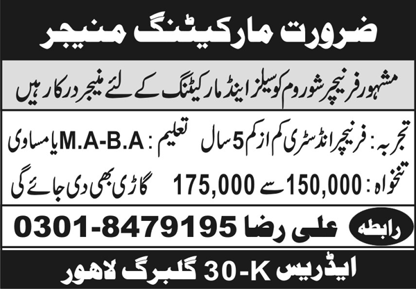 Furniture Showroom Lahore, lahore Punjab Pakistan invites applications from eligible candidates for the post of marketing manager as per advertisement of June 21, 2024 published in daily Nawaiwaqt Newspaper. MA and BA etc. educational qualification will be preferred.