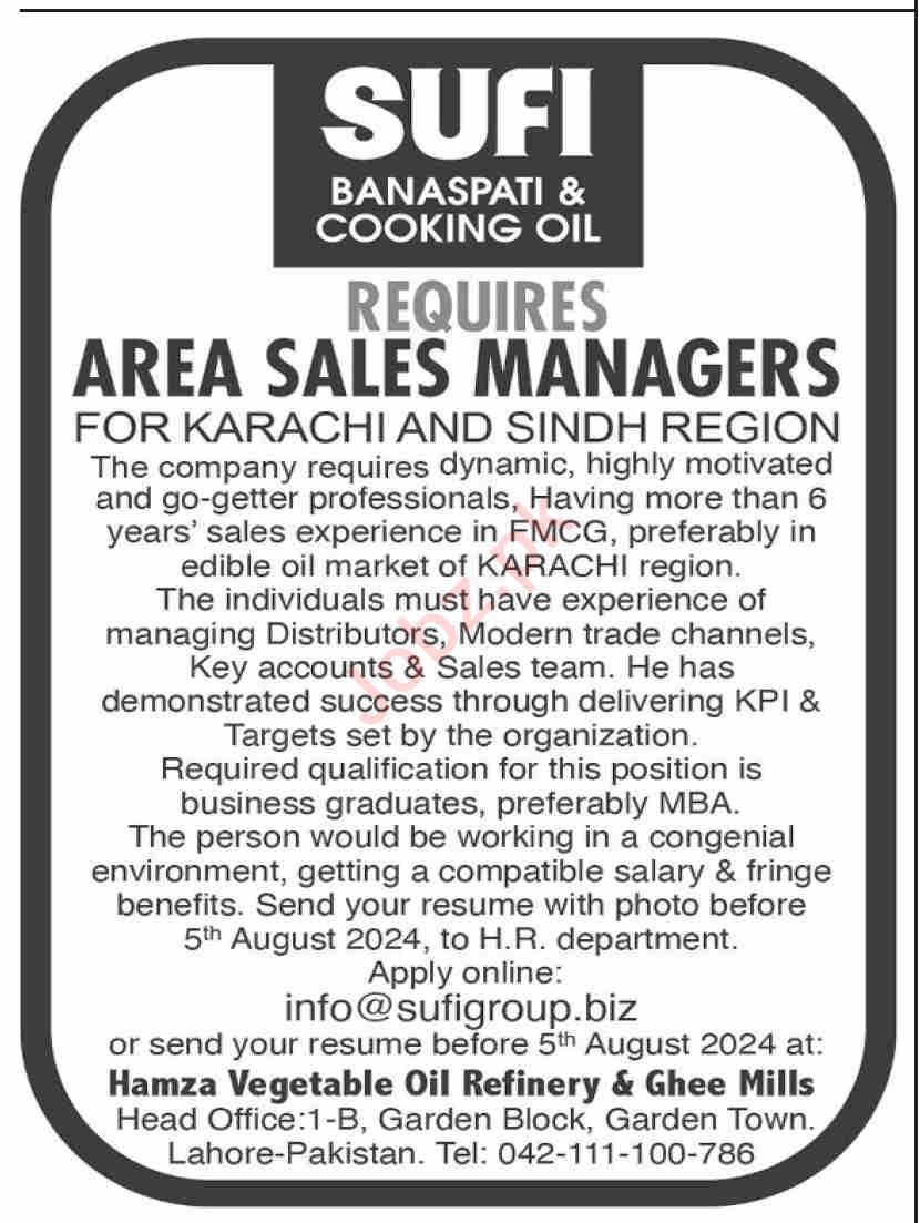 Hamza Vegetable Oil Refinery & Ghee Mills Pvt Ltd latest Private Sales jobs and others can be applied till August 5, 2024 or as per closing date in newspaper ad. Read complete ad online to know how to apply on latest Hamza Vegetable Oil Refinery & Ghee Mills Pvt Ltd job opportunities.
