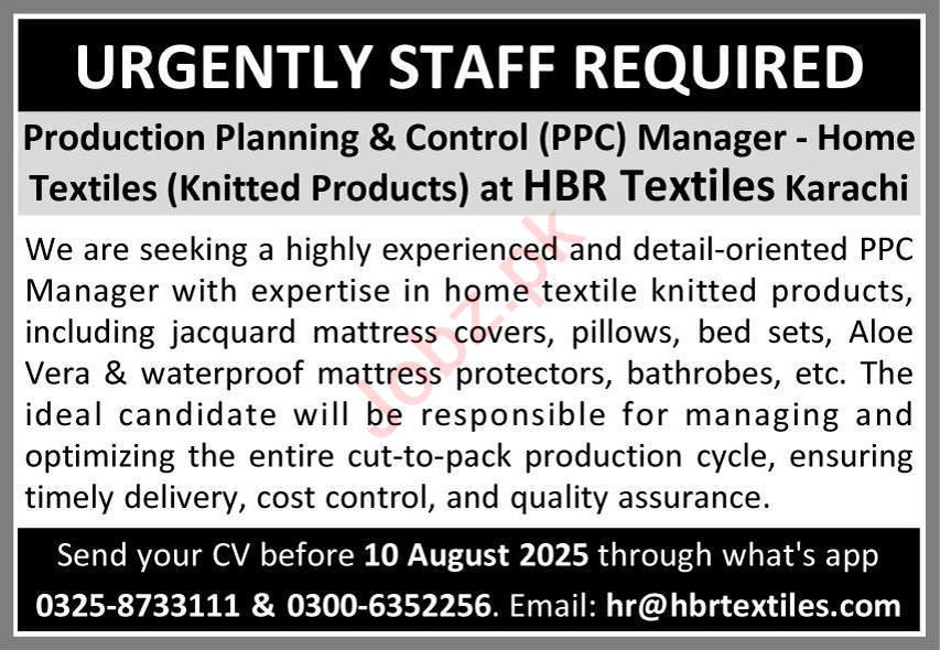 Textile Company invites applications for job positions advertised in daily Express dated 20 July 2025 for following vacancies in Karachi, karachi Sindh Pakistan.