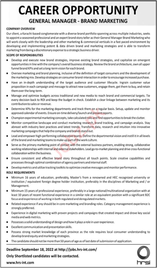 Human Resource Solution International HRSI invites applications for job positions advertised in daily Jang dated 4 September 2022 for following vacancies in Karachi, karachi Sindh Pakistan.