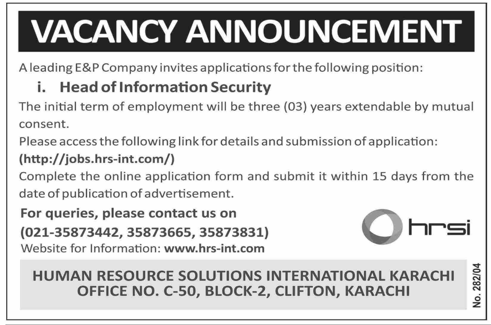 Vacant posts including head of information security are announced in Human Resource Solutions International HRSI Clifton Karachi, karachi Sindh Pakistan as per 16 November 2025 advertisement in daily Dawn Newspaper. Master and Bachelor etc. educational qualification will be preferred.