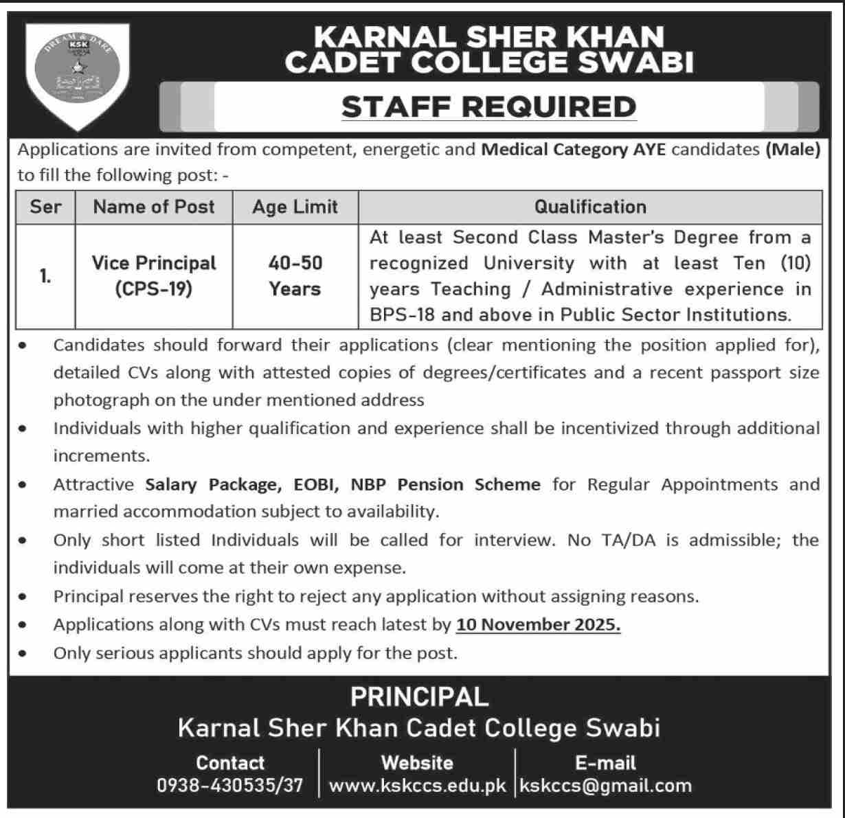 Karnal Sher Khan Cadet College Swabi invites applications for job positions advertised in daily Dawn dated 26 October 2025 for following vacancies in Swabi, swabi Khyber Pakhtunkhwa KPK Pakistan.