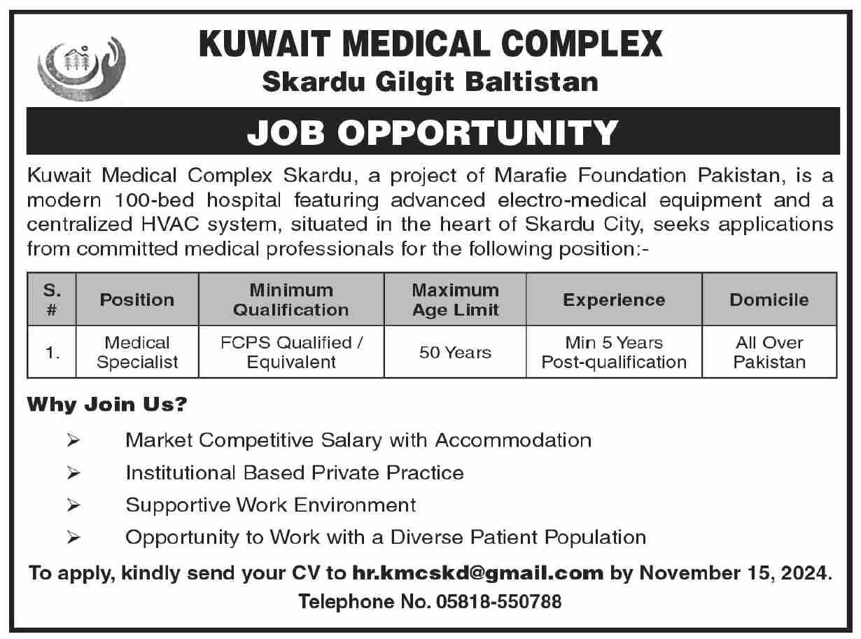 Kuwait Medical Complex KMC Skardu, skardu Gilgit Baltistan Pakistan invites applications from eligible candidates for the post of medical specialist as per advertisement of October 29, 2024 published in daily Dawn Newspaper. Preferred Education is Others and MBBS etc.