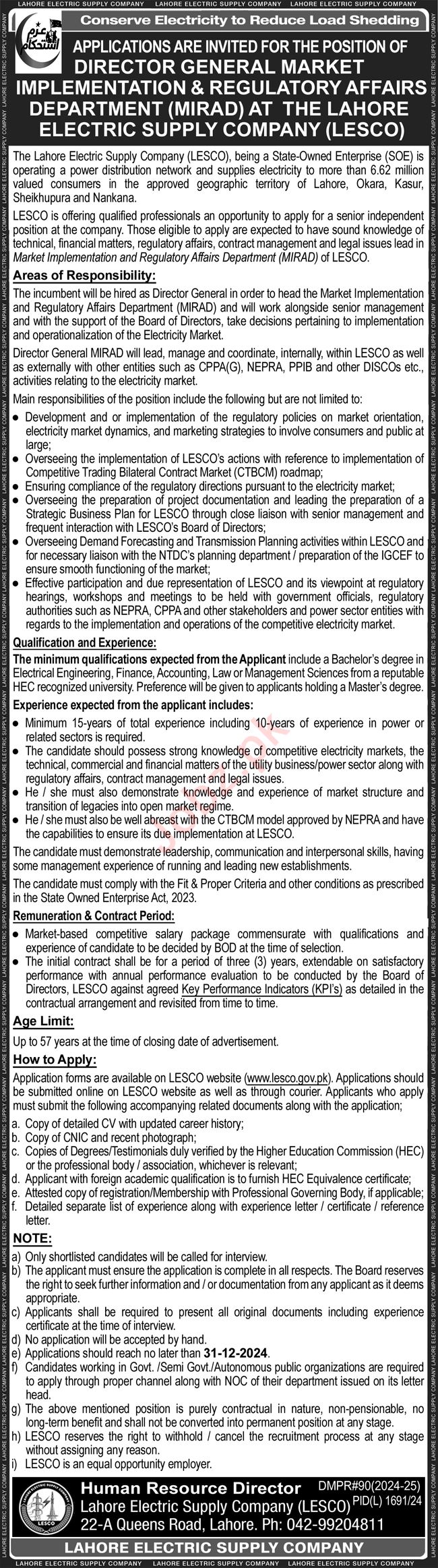 Vacancies in Lahore Electric Supply Company LESCO Advertisement December 2024