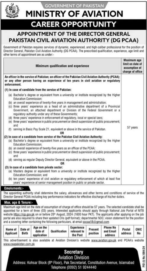 Ministry of Aviation jobs advertisement dated about 10 August 2024 in daily The News Newspaper invites application for the vacant post of director general in Islamabad, islamabad Islamabad Pakistan. Master and Bachelor etc. educational qualification will be preferred.