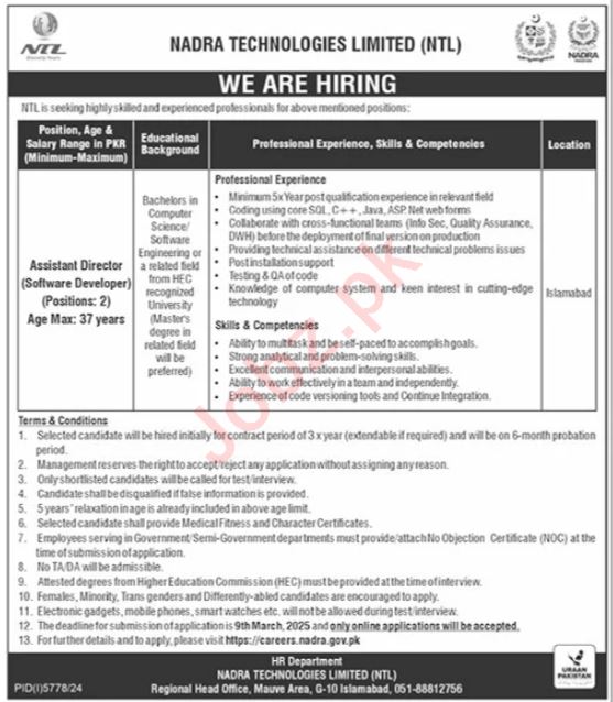 Vacancies in Nadra Technologies Limited NTL Advertisement February 2025