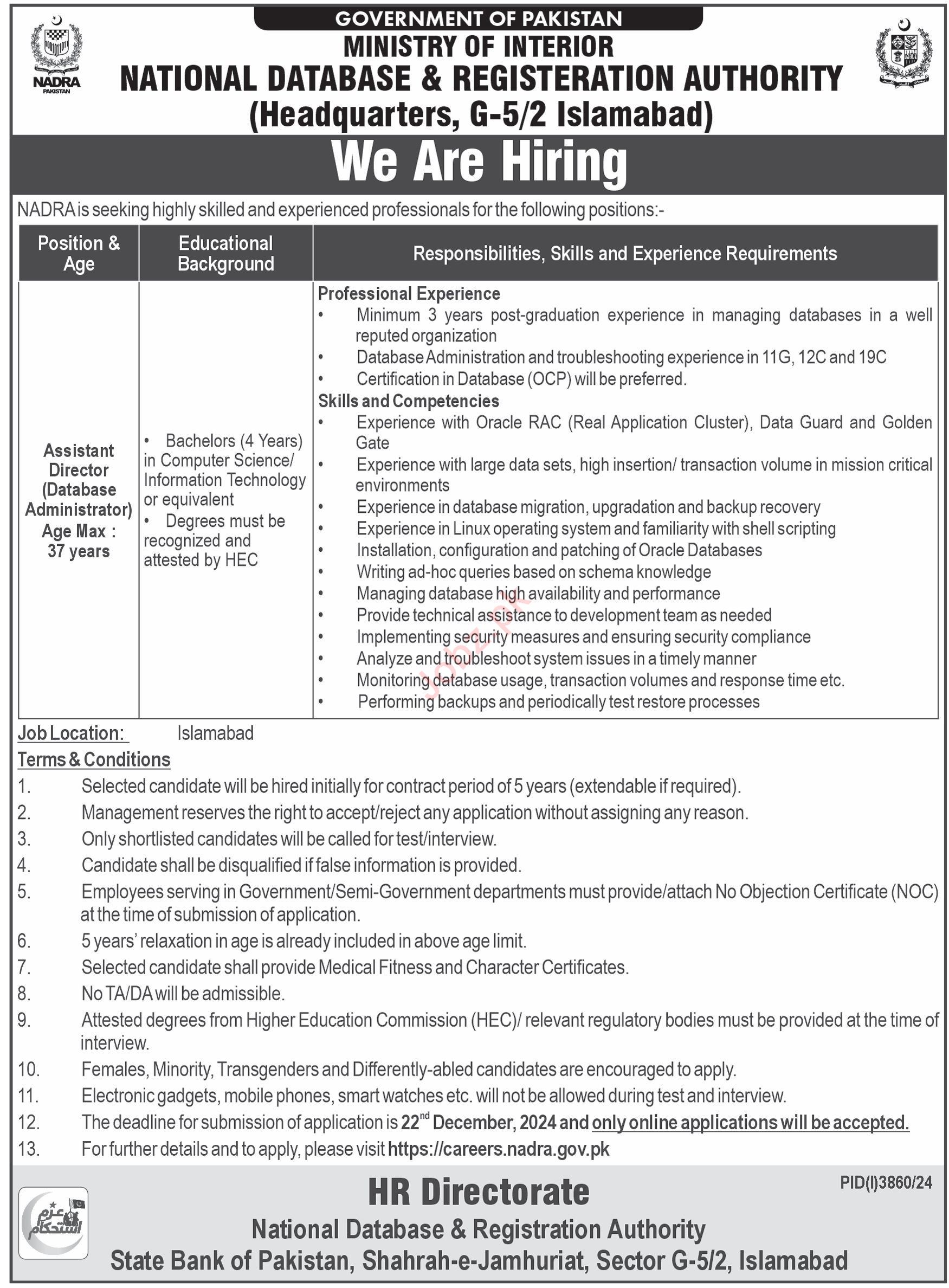 National Database & Registration Authority NADRA invites applications for job positions advertised in daily Express Tribune dated 8 December 2024 for following vacancies in Islamabad, islamabad Islamabad Pakistan.