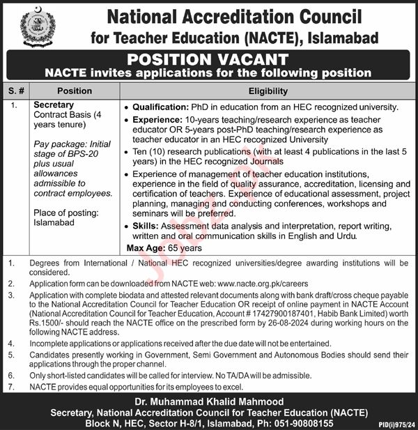 National Accreditation Council for Teacher Education NACTE Islamabad, islamabad Islamabad Pakistan invites applications from eligible candidates for the post of secretary as per advertisement of August 11, 2024 published in daily Nawaiwaqt Newspaper. Educational qualifications required Phd etc.