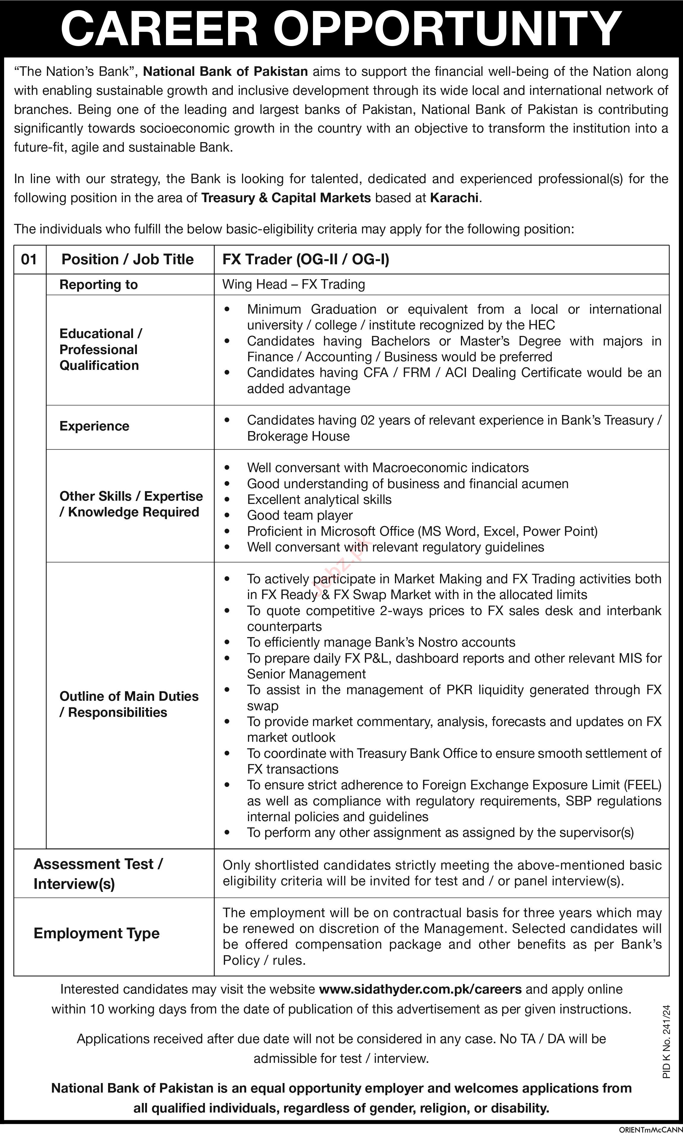 Vacant posts including fx trader are announced in National Bank of Pakistan NBP Karachi, karachi Sindh Pakistan as per 28 July 2024 advertisement in daily Other Newspaper. Educational qualifications required Bachelor and Master etc.
