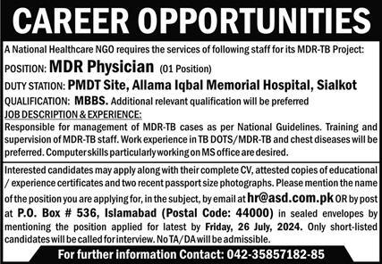 National Healthcare NGO Sialkot, sialkot Punjab Pakistan invites applications from eligible candidates for the post of mdr physician as per advertisement of July 19, 2024 published in daily Express Newspaper. Educational qualifications required MBBS etc.