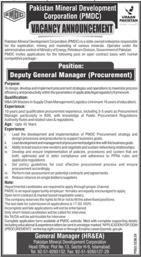 Pakistan Mineral Development Corporation Islamabad, islamabad Islamabad Pakistan invites applications from eligible candidates for the post of deputy general manager procurement as per advertisement of February 3, 2025 published in daily Jang Newspaper. Candidates with Master and MBA etc. educational background will be preferred.