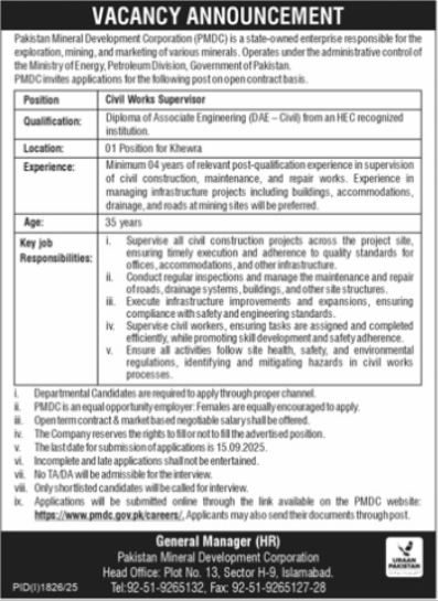 Vacant posts including civil works supervisor are announced in Pakistan Mineral Development Corporation H-9 Islamabad, islamabad Islamabad Pakistan as per 31 August 2025 advertisement in daily Roznama 92 News Newspaper. Persons with DAE etc. education can apply.