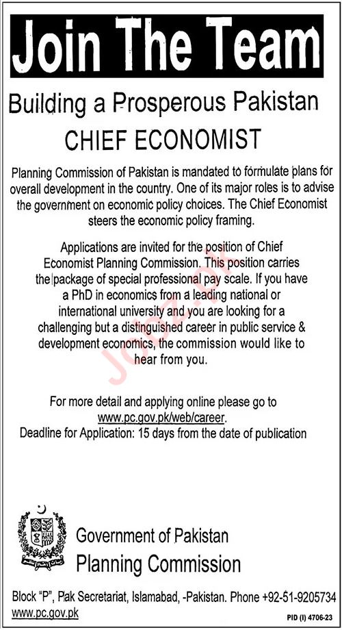 Planning Commission Islamabad, islamabad Islamabad Pakistan invites applications from eligible candidates for the post of chief economist as per advertisement of February 4, 2024 published in daily The News Newspaper. Phd etc. educational qualification will be preferred.