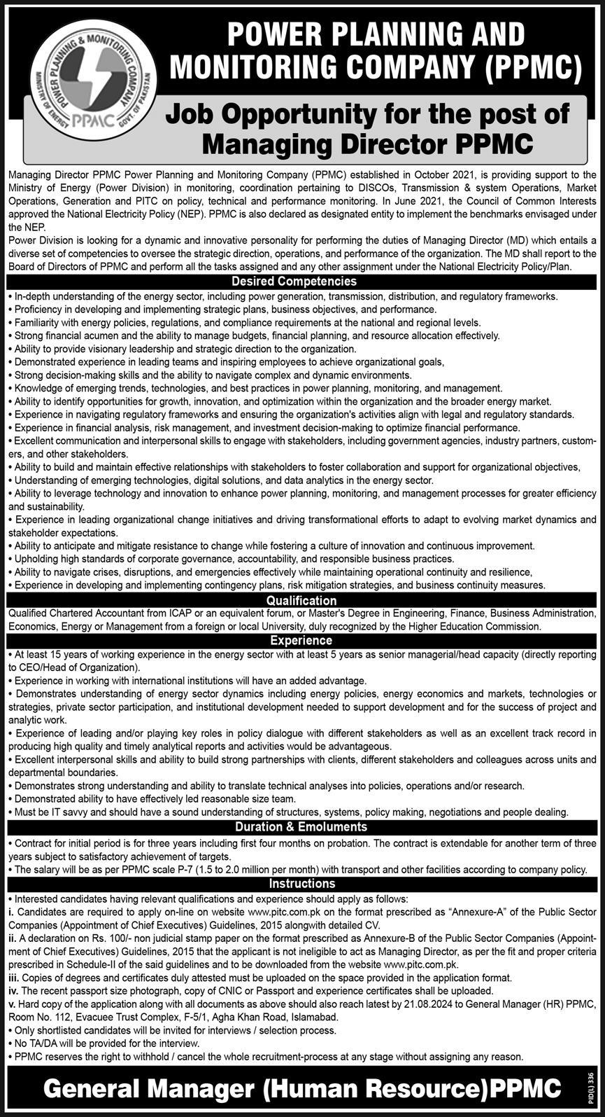 Vacant posts including managing director are announced in Power Planning and Monitoring Company Islamabad, islamabad Islamabad Pakistan as per 6 August 2024 advertisement in daily Express Newspaper. Preferred Education is ACCA and CA etc.