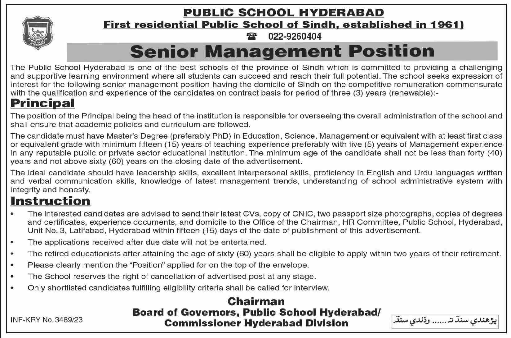 Vacant posts including principal are announced in Public School Hyderabad, hyderabad Sindh Pakistan as per 7 August 2023 advertisement in daily Dawn Newspaper. Educational qualifications required Master and Phd etc.