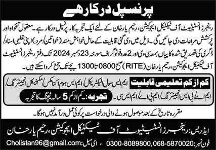 Rangers Institute of Technical Education jobs advertisement dated about 17 December 2024 in daily Express Newspaper invites application for the vacant post of principal in Rahim Yar Khan, rahim yar khan Punjab Pakistan. MS, Master and M.sc etc. educational qualification will be preferred.