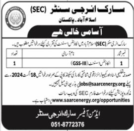Saarc Energy Center SEC jobs advertisement dated about 19 July 2024 in daily Jang Newspaper invites application for the vacant post of accounts assistant in Islamabad, islamabad Islamabad Pakistan. Preferred Education is Master and Bachelor etc.