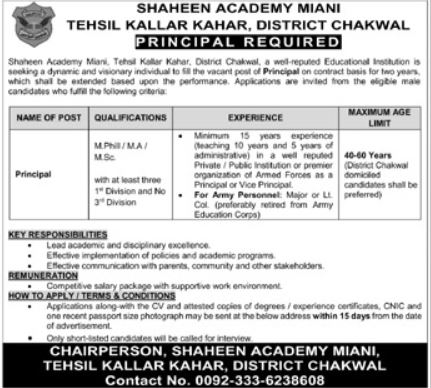 Shaheen Academy jobs advertisement dated about 18 May 2025 in daily Khabrain Newspaper invites application for the vacant post of principal in Chakwal, chakwal Punjab Pakistan. MA, Mphil and M.sc etc. educational qualification will be preferred.